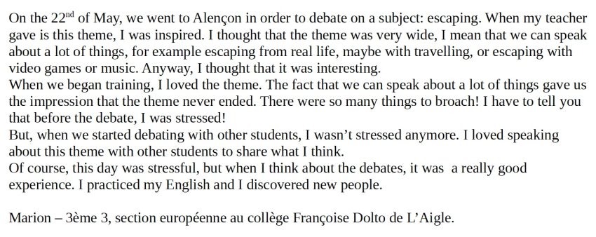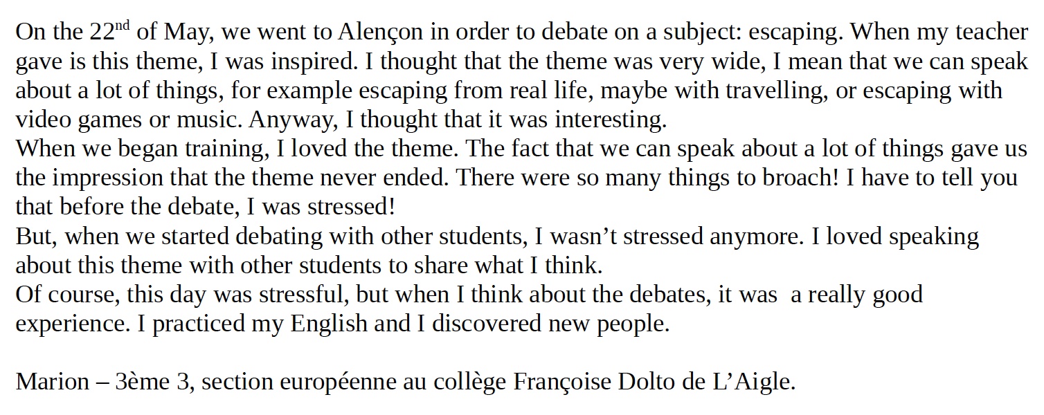 Les élèves du collège Jacques Brel de la Ferté Macé et du collège Jean Racine d’Alençon se sont rencontrés en demi-finale pour débattre "Fiction helps people cope with reality". Le débat a été remporté par les élèves du collège Jean Racine d’Alençon.