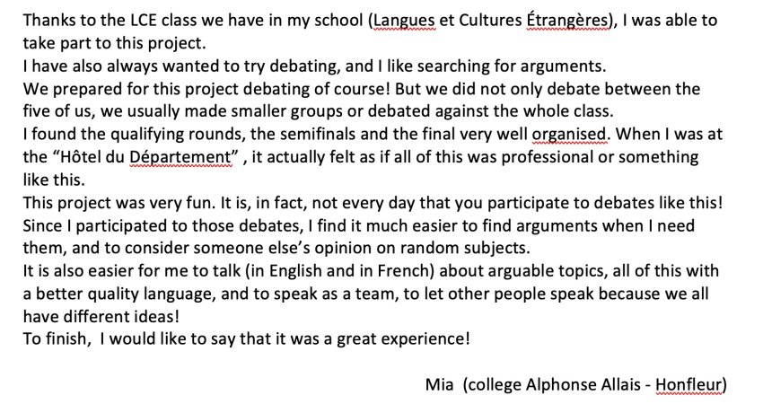 Le public ainsi que les membres des jurys ont été impressionnés par la qualité des échanges menés en anglais au cours de ces débats. Merci aux enseignants qui entraînent leurs élèves, aux professeurs qui organisent les rencontres, aux collèges et aux Conseils Départementaux qui accueillent les équipes. Félicitations à tous ces jeunes, futurs citoyens européens, qui prennent plaisir à réfléchir et débattre de leurs idées avec respect et en langue étrangère.