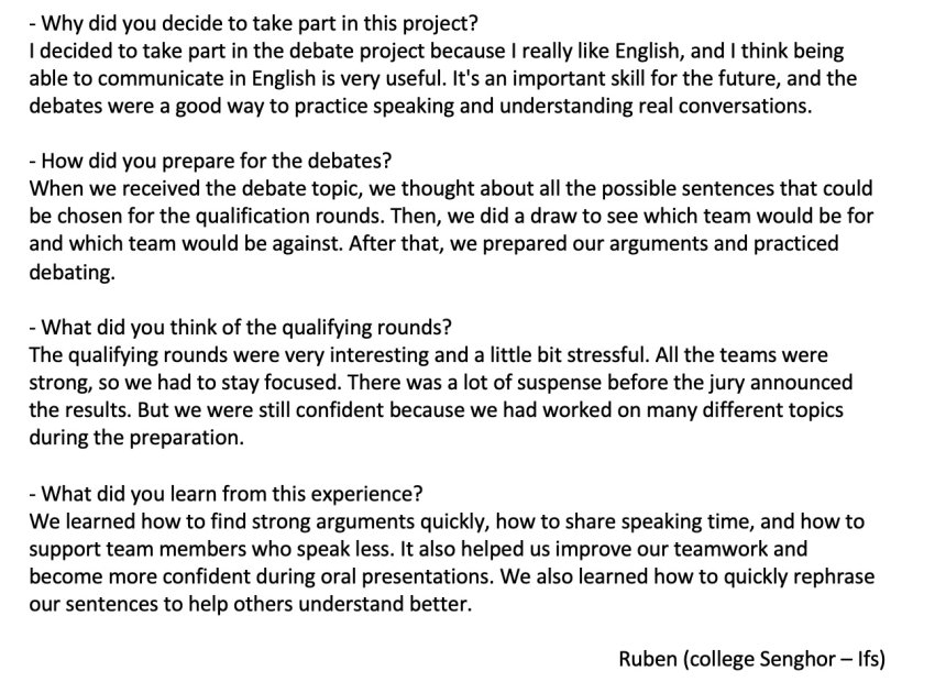 Pour plus d’informations concernant le concours à venir, vous pouvez consulter l’article intitulé "Concours de débats citoyens en anglais : l’édition 2026 est lancée".