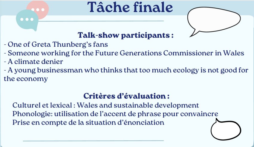 J’ai mené cette séquence intitulée « Wales Goes Green » dans deux classes de seconde. La problématique était la suivante : “to what extent can a small nation, like Wales be at the forefront of sustainable development ?” La tâche finale était un talk-show (un débat un peu informel, que l’on pourrait voir à la télévision, entre plusieurs élèves qui ont chacun un rôle à jouer) et était libellée ainsi : « a talk-show about sustainable development in Wales ».