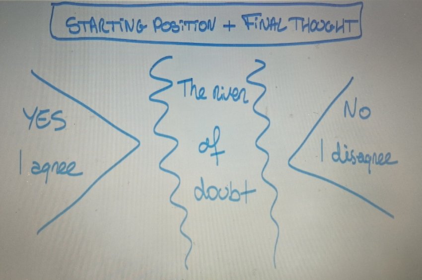 Lors d’une formation commune avec l’OCCE, j’ai découvert le débat mouvant. Il consiste à délimiter dans l’espace de la classe une rivière du doute (deux tables peuvent suffire). De chaque côté, et après s’être mis en ligne (starting point) afin de prendre le temps de réfléchir et de pondérer leur opinion, les élèves se positionnent selon leur conviction (AGREE/ DISAGREE) par rapport à leur réponse à la question de départ. Plus les élèves s’éloignent de la rivière du doute, plus ils expriment un point de vue assumé, une certitude quant à la manière de répondre à la question soulevée.