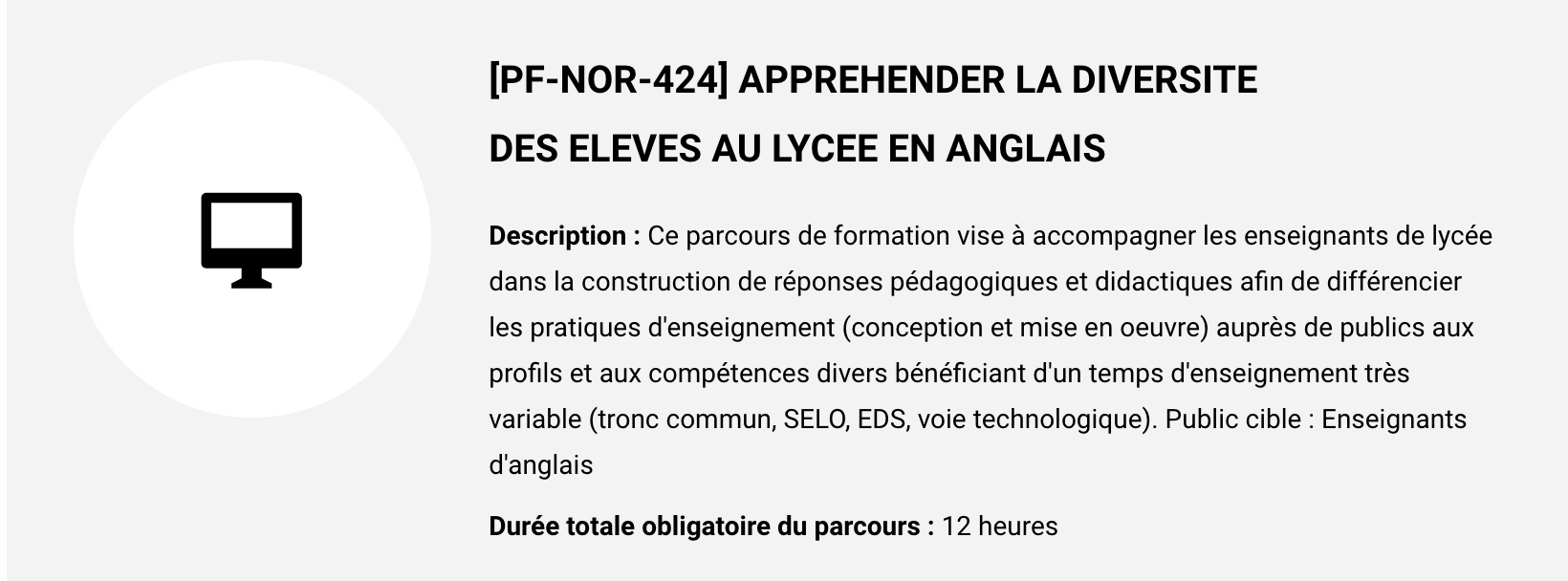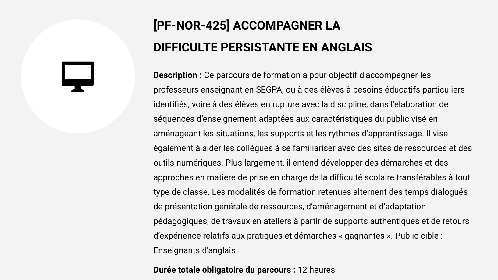Pour en savoir plus sur ce parcours de formation : https://anglais.ac-normandie.fr/Un-stage-Anglais-Accompagner-la-difficulte-persistante
