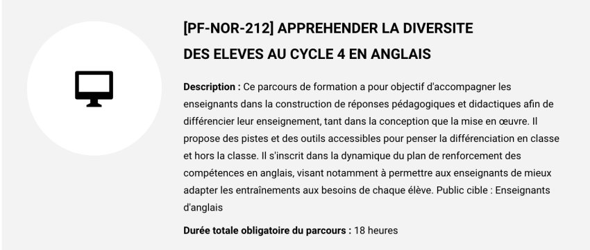 Pour en savoir plus sur ce parcours de formation : https://anglais.ac-normandie.fr/Apprehender-la-diversite-des-eleves-au-cycle-4-premier-volet-d-un-parcours-de