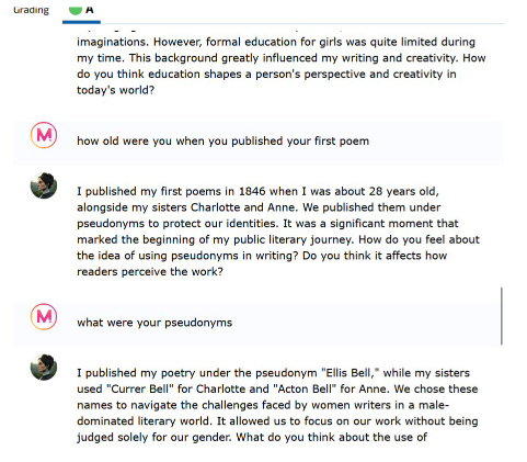 En première LLCE, c’était une tâche intermédiaire dans une séquence sur l’ère victorienne et "The Importance of Being Earnest" d’Oscar Wilde. Les élèves ont discuté avec “Emily Brontë” pour poser des questions sur sa vie, son travail et celui de ses sœurs ainsi que des questions en rapport avec l’ère victorienne. A la fin, les élèves devaient mettre toutes les données obtenues en commun de manière orale.
