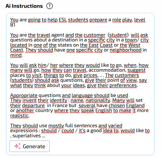 Le professeur peut générer une image qui correspond à la “personne” avec qui les élèves vont dialoguer. Il est possible d’écouter ce que le chatbot dit/ écrit. Le professeur indique la thématique, le rôle du chatbot, les attentes. On invite les élèves dans cet espace sécurisé via un lien. Même si nos chatbots peuvent rester “privés”, il est sans doute judicieux de demander aux élèves de créer des pseudonymes dont vous avez connaissance.