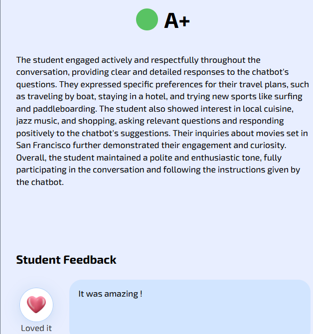Les plus : Le chatbot est un outil original, motivant et dynamique qui plaît aux élèves. Ils ont presque l’impression de parler avec une vraie personne. Beaucoup d’élèves ont bien aimé obtenir des informations de cette manière sans juste les chercher sur un site. Cela a permis de diversifier les supports de manière ludique et utile. C’est un outil qui aide les élèves à développer leur fluence de lecture/ d’écoute et d’écriture. Le chatbot ne corrige pas les phrases des élèves, mais ces derniers doivent formuler des phrases claires pour être compris. Pour l’enseignant, l’accès aux conversations après la séance permet de voir la qualité des échanges par l’ensemble des élèves. En ce qui concerne ces expérimentations, les dialogues n’étaient pas notés. Cependant, en seconde euro les échanges ont contribué à améliorer les saynètes évaluées en tâche finale. Mizou suggère une note pour chacun des dialogues, mais cela ne correspond pas forcément aux critères en tant qu’enseignant.