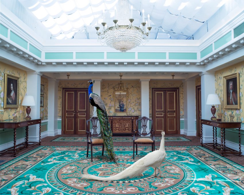 The Lanesborough series is in a part of London called Knightsbridge or Belgravia. And in fact, it sort of links to my family because my family, when they moved from the United States, they were travelers, you know, they lived in different places in Europe, they lived in Germany, etc. and my mother had always wanted to live in Belgravia in this part of London. So they managed in 1976 to find a flat with a 25-year lease in a very pretty square called Lowndes Square nearby, right ? And the local hospital was St. George in that Palladian style, English style of architecture. And some of that you have around Regent’s Park as well. So when that hospital became converted into a luxury hotel, it was extraordinary. What had happened was—that work is a product of a commission. I don’t know if you know the magazine called Departures. It’s a travel magazine. So, somehow someone got a hold of me, my name, or saw my work and said, “we’re in the process of restoring this hotel. It’s just been finished by this very famous designer who’s just died. Can you have a look at it and see whether you can do some work ?” So I said, okay, let’s have a look. I was curious, you know, this was a hospital now turned into a luxury hotel. So it has a very symbolic sort of location, if you like. And so I rose to it. And I decided then that the underlying story of that series would be a wedding. And in fact, the short story in the catalog book refers to that, where I come and visit, and these two, a white peacock and a regular colorful peacock, are about to get married, and then all this menagerie of animals - which refer to the different Commonwealth countries - come. So, you know, again, inspired by the heritage of Britain, if you like, and its empire…the one motif I’ve dealt with in Britain with my work is the first work.
